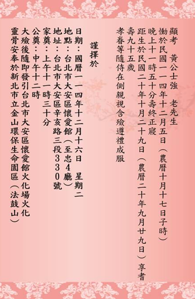 雲端訃聞暨追思會資訊:https://eobituary.lyls.com.tw/invitationcard/36012
