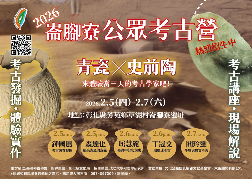 本會將於 115年2月5日(四)至2月7日(六) 舉辦「崙腳寮公眾考古營隊」,透過專業講座與實地操作,引導學員認識考古學的研究方法、遺址內涵及相關文化資產價值,並實際參與考古田野發掘與出土標本整理工作。